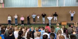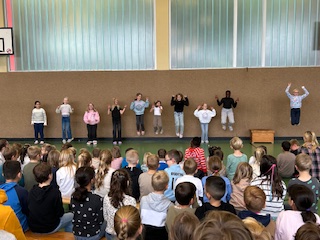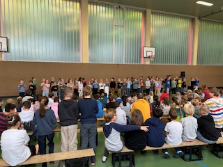 Die Schulgemeinde traf sich in der Turnhalle zum Monatsthema. Die Zweitklässler sangen ein Freundschaftslied und alle machten mit. In die Welt des Musikwerkes “Peter und dem Wolf” entführten uns die Kinder der Klassen 3a und 3b und wussten mit ihrem Wissen aus dem Unterricht zu glänzen. Einen Tanz führten Kinder der Klasse 4a auf. Sportlich zu ging es auch bei der 4b: Einige Kinder zeigten ihr turnerisches Können. Die abschließende Lehrer-Challenge mit Fragen der 4b-Kinder verlangte den teilnehmenden Lehrkräften alles. Knapp konnte sich das Team von Frau Baroth, Frau Kara und Herrn Koch durchsetzen.