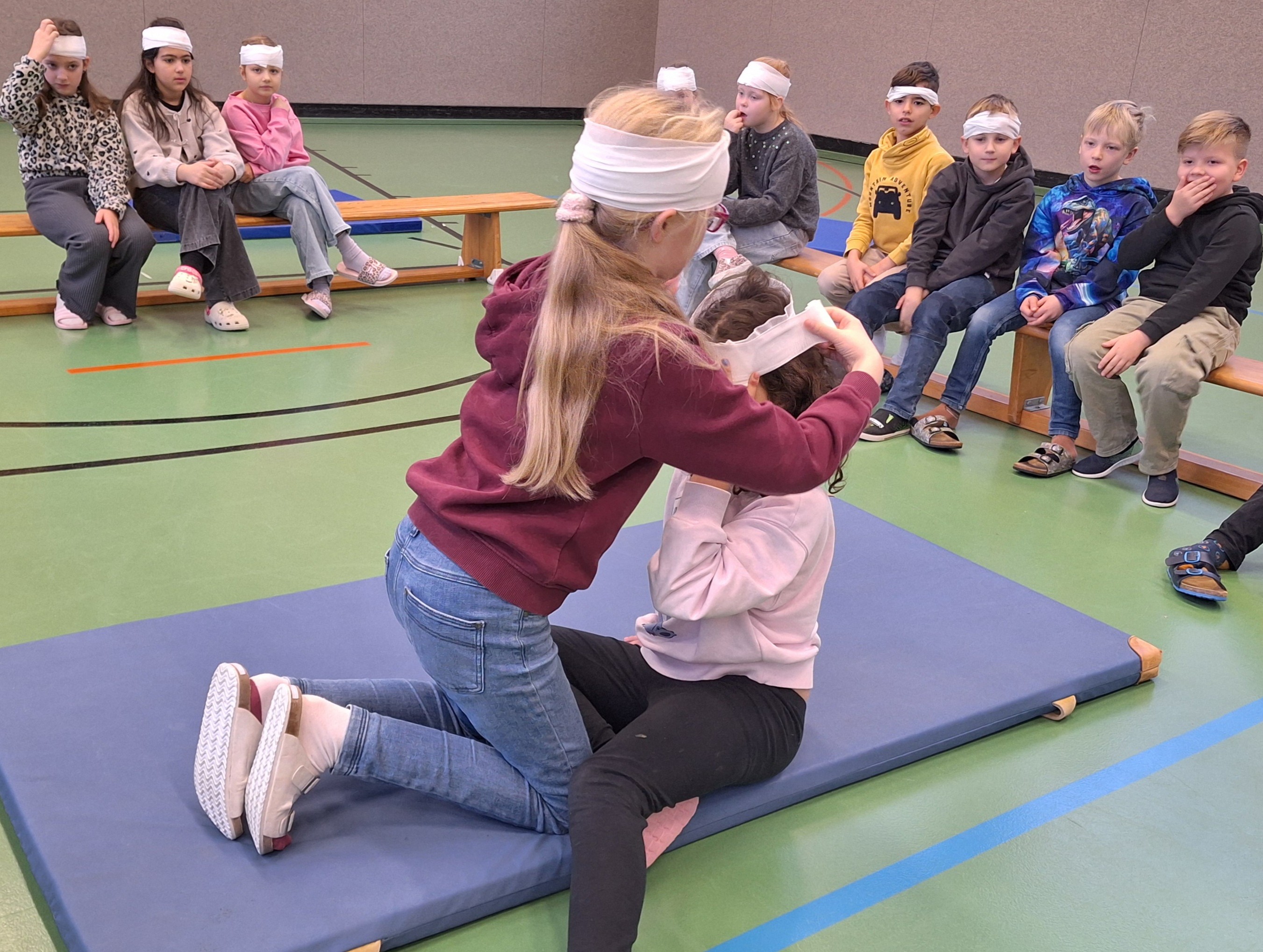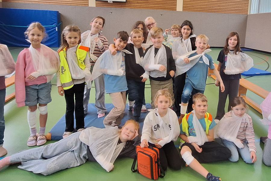 Zu Besuch war Annica Stamm, die Mutter eines Kindes aus der Klasse 3a. Sie leitete den spannenden und lehrreichen Workshop rund um das Thema Erste Hilfe. Die Kinder lernten den richtigen Umgang mit Verletzungen und Notfallsituationen. Sie übten das Anlegen von Kopf-, Arm- und Fußverbänden, klebten Pflaster, arbeiteten mit Kühlpacks und erfuhren, wie man Kinder und Erwachsene im Notfall richtig begleitet.