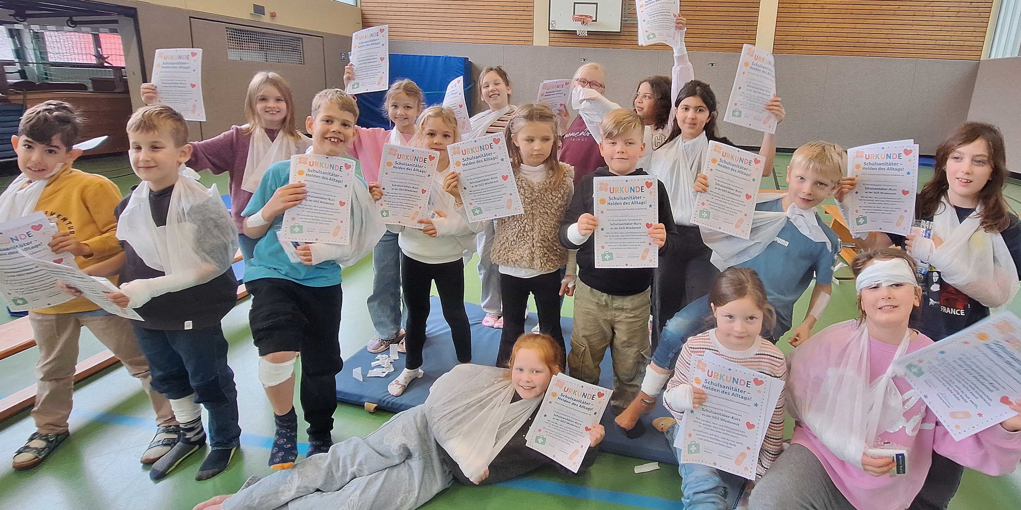 Große Freude an unserer Schule: 18 Kinder aus den Klassen 2 bis 4 wurden erfolgreich zu Pausensanitätern ausgebildet!