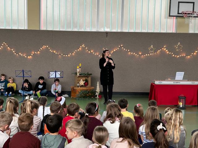 Stimmungsvoll und äußerst musikalisch ging es kurz vor dem Ferienstart in der Turnhalle zu. Das Monatsthema stand an. Frau Krumme (Piano) und Frau Berg (Bratsche) begeleiteten auf ihren Instrumenten die singenden Kinder. Die Flöten-AG zeigte ihr Können und das SchüPa überreichte die Pokale. Der Umweltpokal ging an die Klasse 4a. Unsere Reinigungskraft Frau Hein erhielt den Pokal für “Helfende Hände”. Frau Stamm (Mutter aus der Klasse 3a) hatte die tolle Idee, die Ausbildung der Schulsanitäter noch einmal vorzunehmen. Dafür erhielt sie den Pokal für “Gute Ideen”.