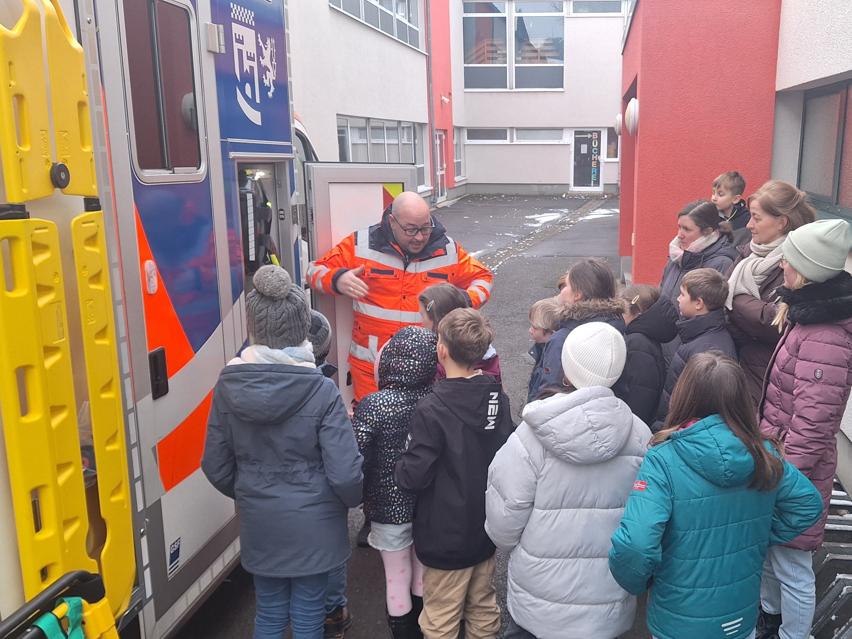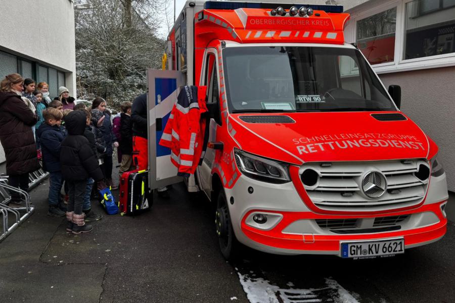 Vor Kurzem bekamen unsere ausgebildeten Schulsanitäterinnen und Schulsanitäter besonderen Besuch: Notfallsanitäter Selcuk Baylan kam mit seinem Rettungswagen vom Rettungsdienst des Oberbergischen Kreises an unsere Schule. Gemeinsam mit Frau Annika Stamm, die die Kinder zuvor ausgebildet hatte, stellte er den Rettungswagen und seine Ausstattung vor.