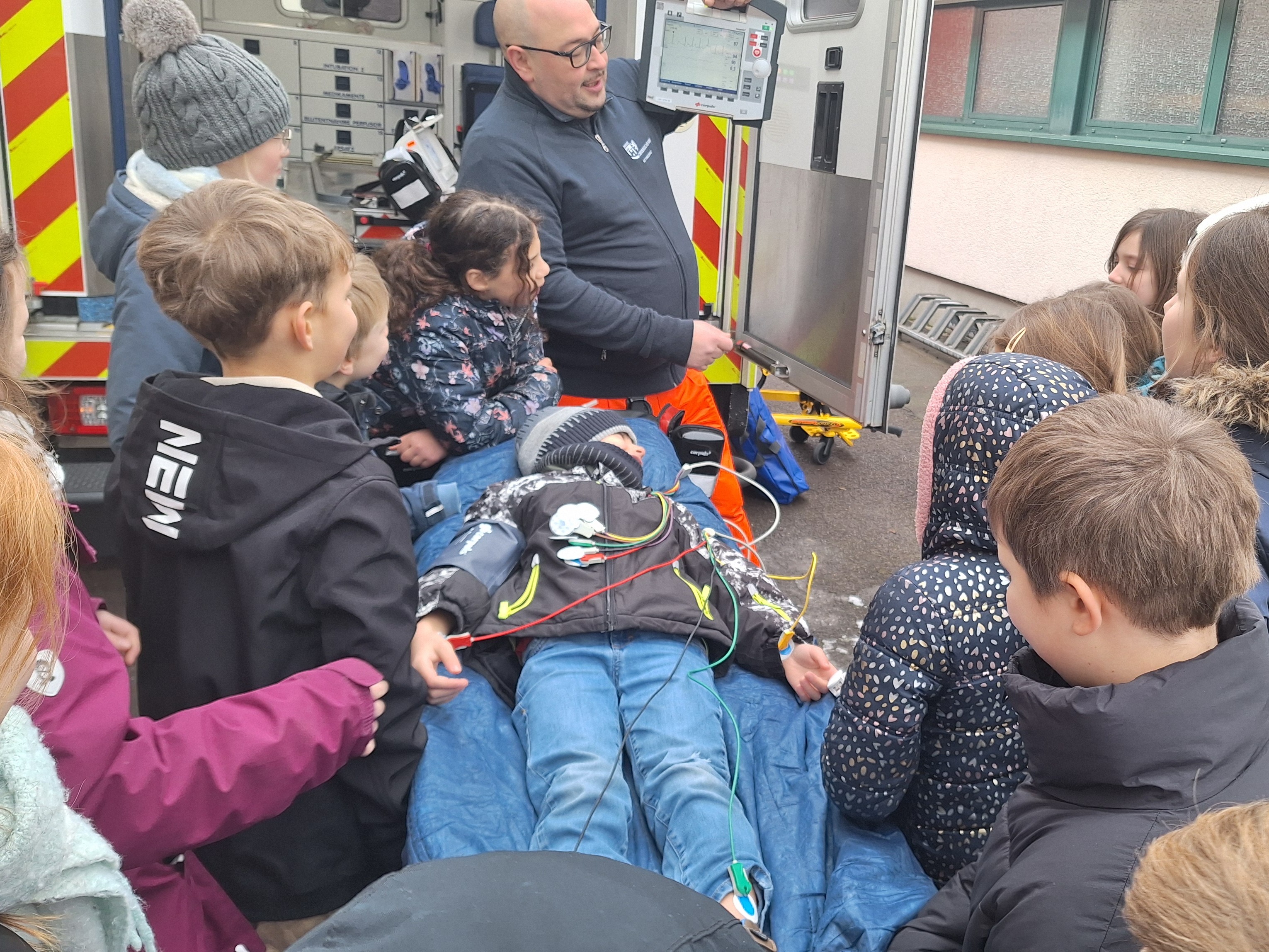 Die Schülerinnen und Schüler durften die vielen Geräte und Funktionen aus nächster Nähe kennenlernen. Staunend und mit großem Interesse verfolgten sie die anschaulichen Erklärungen. Besonders spannend war das EKG-Gerät, an dem beispielhaft Herzfrequenz, Blutdruck und Sauerstoffsättigung eines Schülers gemessen wurden.