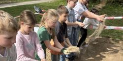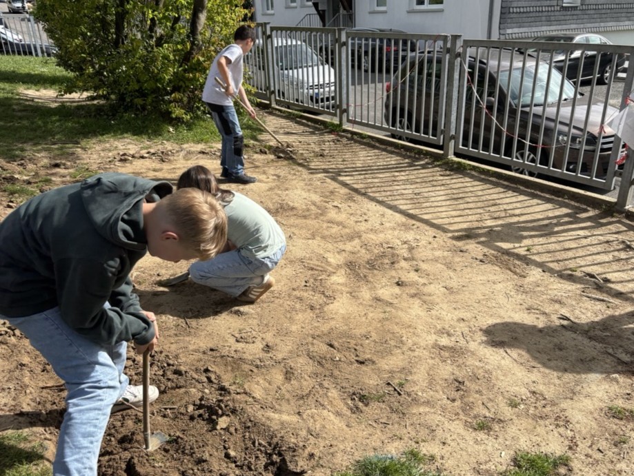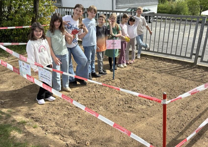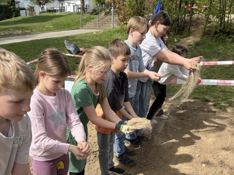 Am Montag war es endlich so weit! Mit viel Energie und Teamarbeit wurde die ausgewählte Fläche umgegraben. Danach streuten die Kinder die Wildblumensamen aus und gossen alles gründlich. Damit niemand versehentlich über die frisch angelegte Wiese läuft, wurde der Bereich abgesperrt. Außerdem gab es eine Durchsage über die Sprechanlage, damit wirklich alle Bescheid wissen.