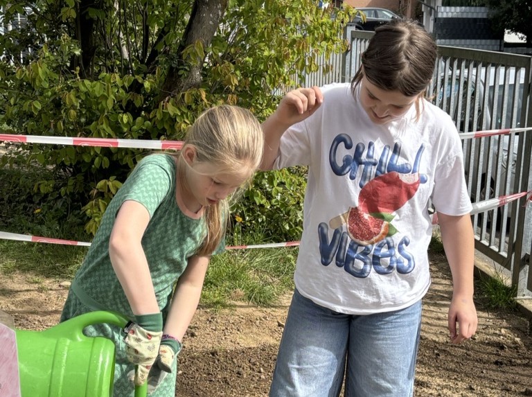 Bevor es losgehen konnte, musste aber einiges vorbereitet werden. Zuerst stellten die Kinder einen Antrag beim Schüpa. Dann hieß es geduldig warten, bis die Antwort kam. Parallel suchten sie eine geeignete Stelle auf dem Schulgelände aus – nicht zu schattig, nicht zu sonnig, und natürlich gut sichtbar für alle. Danach warteten sie noch auf die richtige Wetterlage, denn Blumensamen brauchen gute Bedingungen, um zu wachsen.