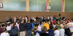 Die Schulgemeinde traf sich in der Turnhalle zum Monatsthema. Die Zweitklässler sangen ein Freundschaftslied und alle machten mit. In die Welt des Musikwerkes “Peter und dem Wolf” entführten uns die Kinder der Klassen 3a und 3b und wussten mit ihrem Wissen aus dem Unterricht zu glänzen. Einen Tanz führten Kinder der Klasse 4a auf. Sportlich zu ging es auch bei der 4b: Einige Kinder zeigten ihr turnerisches Können. Die abschließende Lehrer-Challenge mit Fragen der 4b-Kinder verlangte den teilnehmenden Lehrkräften alles. Knapp konnte sich das Team von Frau Baroth, Frau Kara und Herrn Koch durchsetzen.