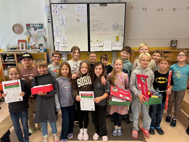 Die Religionskurse der dritten und vierten Klasse haben sich dafür entschieden, bei der Schuhkarton-Aktion zum Weihnachtsfest mitzumachen. Gemeinsam wurde überlegt, womit man Kindern, denen es nicht so gut geht wie uns, eine Freude bereiten kann. Geklärt wurde, für welches Geschlecht Päckchen gepackt und was dort hineingegeben werden soll. Im Rahmen der Möglichkeiten brachten Kinder in den Klassen dann entsprechende Hygiene-, Kleidungs oder Spielartikel mit. Bald gehen nun die Kartons auf ihre Reise. Wir freuen uns, anderen Kindern damit eine kleine Freude machen zu können.