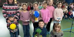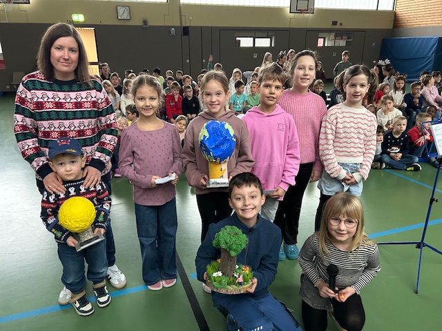 Stimmungsvoll und äußerst musikalisch ging es kurz vor dem Ferienstart in der Turnhalle zu. Das Monatsthema stand an. Frau Krumme (Piano) und Frau Berg (Bratsche) begeleiteten auf ihren Instrumenten die singenden Kinder. Die Flöten-AG zeigte ihr Können und das SchüPa überreichte die Pokale. Der Umweltpokal ging an die Klasse 4a. Unsere Reinigungskraft Frau Hein erhielt den Pokal für “Helfende Hände”. Frau Stamm (Mutter aus der Klasse 3a) hatte die tolle Idee, die Ausbildung der Schulsanitäter noch einmal vorzunehmen. Dafür erhielt sie den Pokal für “Gute Ideen”.