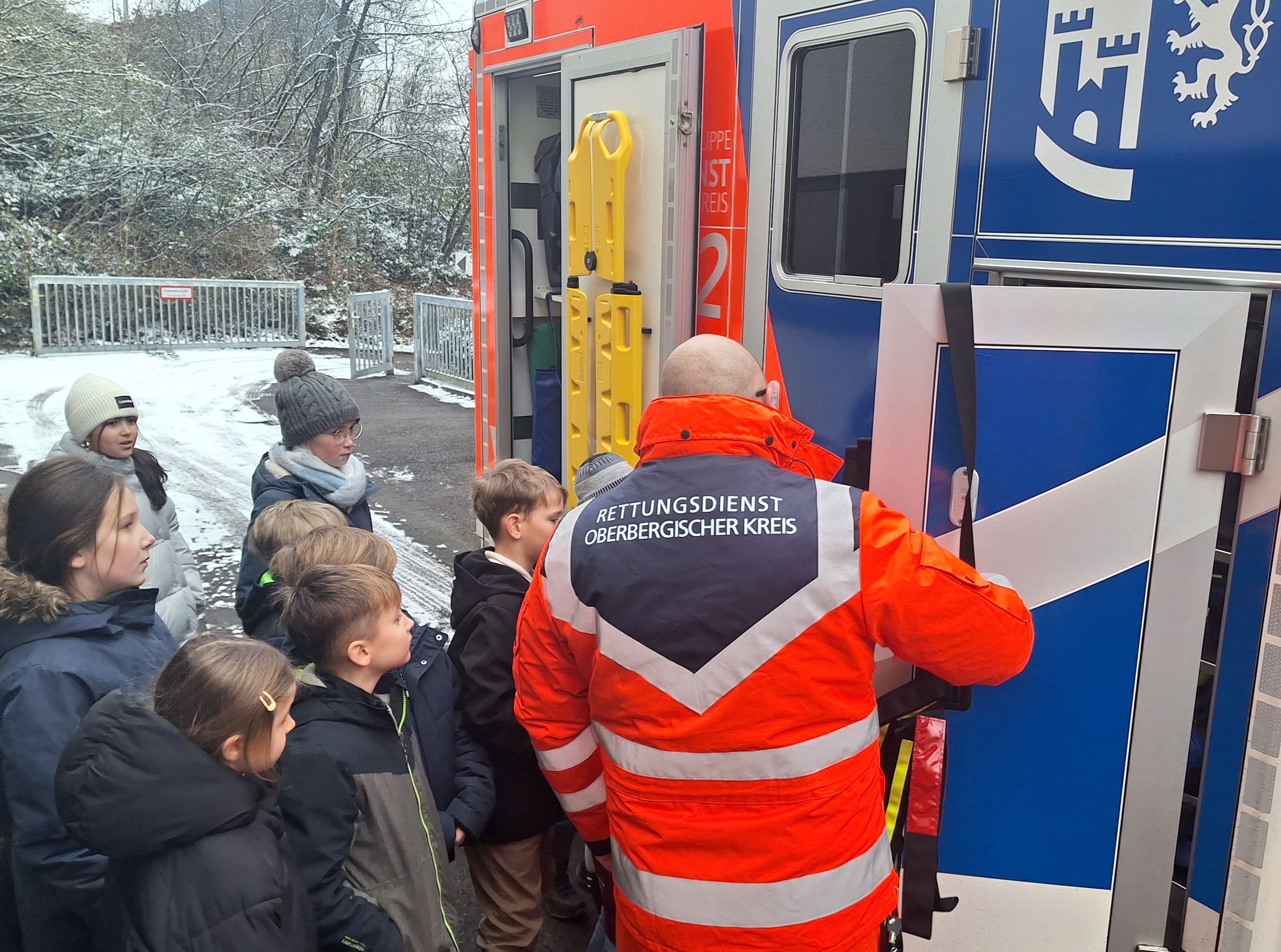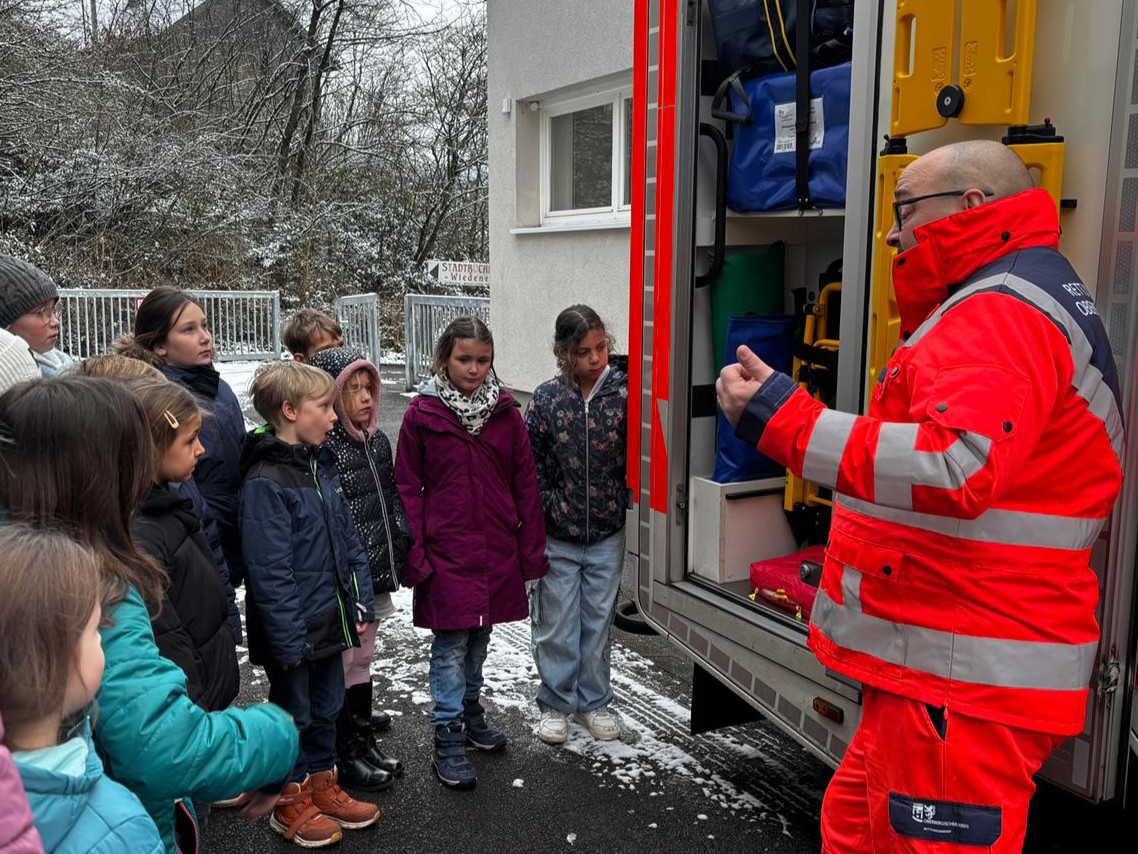 Vor Kurzem bekamen unsere ausgebildeten Schulsanitäterinnen und Schulsanitäter besonderen Besuch: Notfallsanitäter Selcuk Baylan kam mit seinem Rettungswagen vom Rettungsdienst des Oberbergischen Kreises an unsere Schule. Gemeinsam mit Frau Annika Stamm, die die Kinder zuvor ausgebildet hatte, stellte er den Rettungswagen und seine Ausstattung vor.