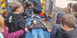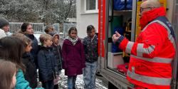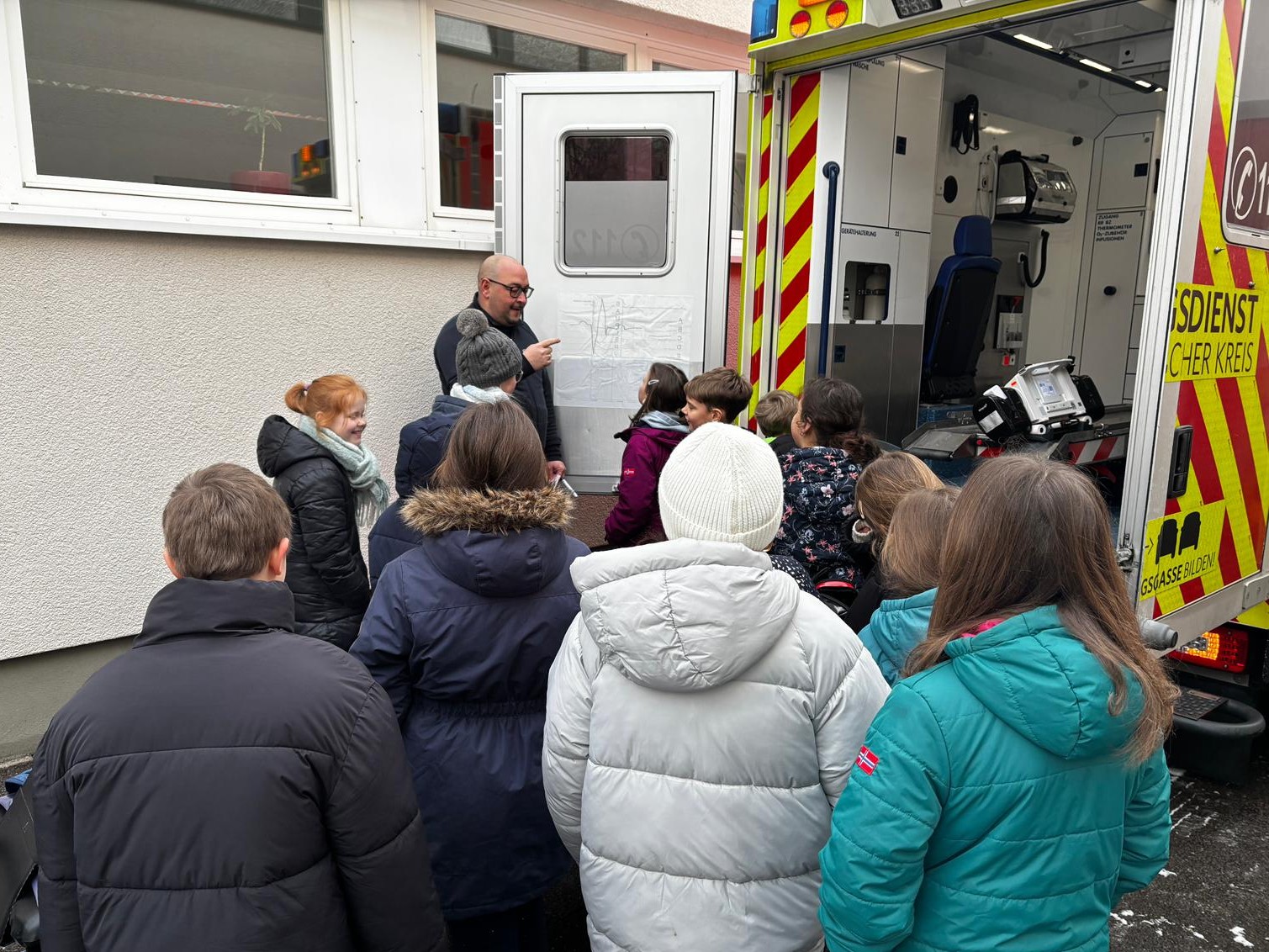 Außerdem wurden der Tragestuhl, die Trage, der Beatmungsbeutel mit Sauerstoffflaschen sowie verschiedene Materialien wie Spritzen, Nadeln und Notfallrucksäcke vorgestellt. Zum krönenden Abschluss durften alle noch das Blaulicht sehen und das Signalhorn hören.